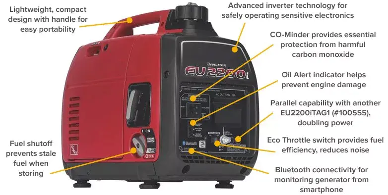 More power, same legendary quality. advanced inverter technology provides 2,200-Watt of quiet, light-weight and fuel-efficient power. The EU2200i can power a wide variety of applications, making it perfect for portable use at home, tailgating, camping, on the job-site and much more. Exceptionally efficient, it can run up to 8.1-hours on a single tank of fuel. The EU2200i can be connected in parallel with EU2200i Companion model giving you 4,400-Watt of power. exclusive My Generator smartphone app offers remote generator operation and monitoring with impressive performance and unmatched convenience. The free app includes wireless stop, operation monitoring, as well as service reminders. with the EU2200i you can rest easy, knowing your generator is covered from top to bottom for 3 full years residential & 1 year commercial.